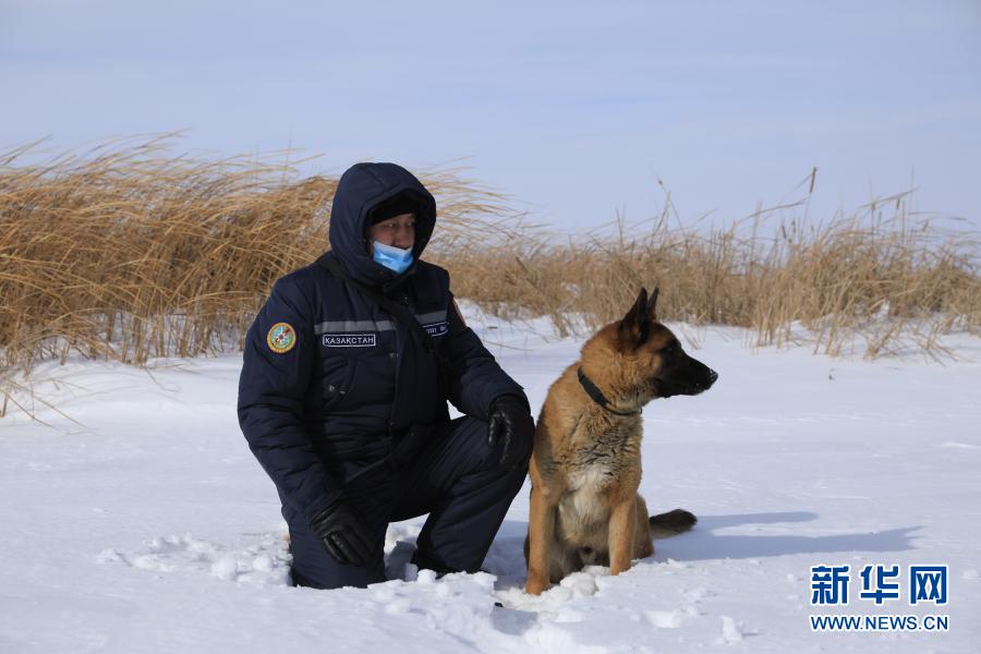 3月4日,救援人员与搜救犬在哈萨克斯坦巴甫洛达尔市参加春季防洪演习。