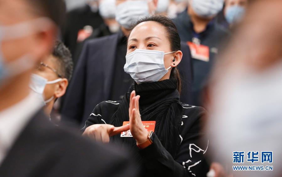 3月5日,第十三届全国人民代表大会第四次会议在北京人民大会堂开幕。这是列席大会的全国政协委员、中国残疾人艺术团团长邰丽华用手语“唱”国歌。新华社记者 张玉薇 摄