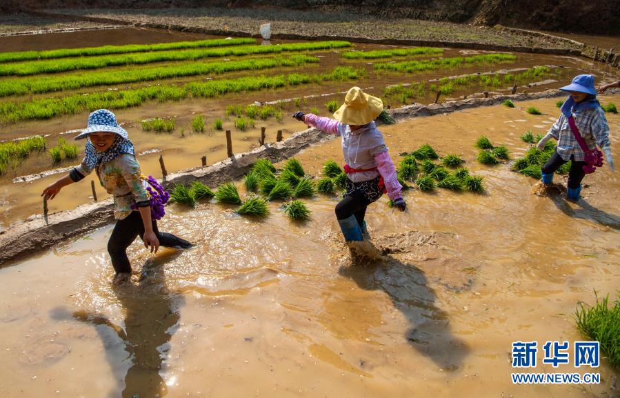 郭玉兰(左)与村民们在田里劳动(3月4日摄)。新华社记者 江文耀 摄
