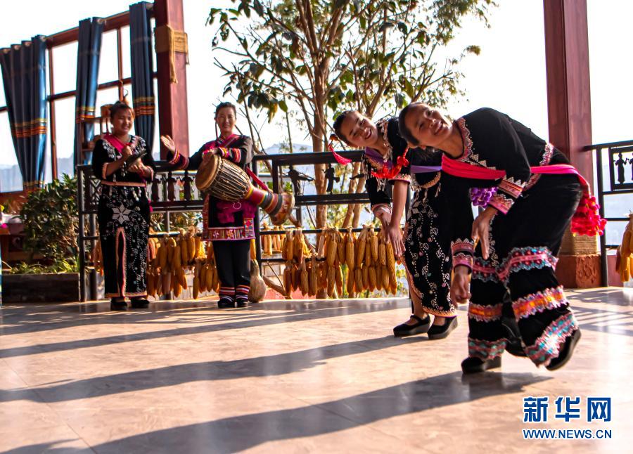 罗娜算(左一)、郭玉兰(右二)与“摆舞队”队员们在村里排练舞蹈,此时的舞姿展现的是春天插秧时的场景(3月4日摄)。新华社记者 江文耀 摄