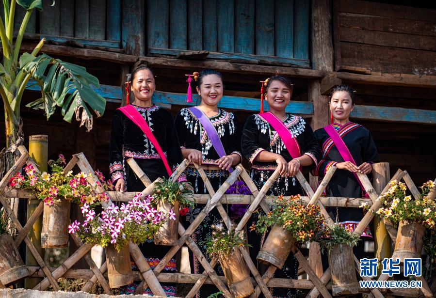 罗娜算(右二)、郭玉兰(左二)与“摆舞队”队员们在村里合影(3月4日摄)。新华社记者 江文耀 摄