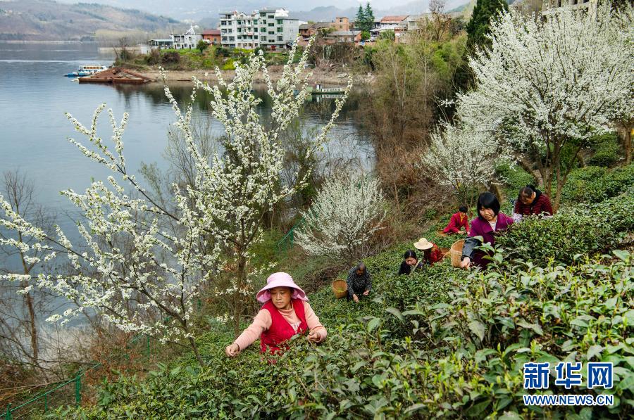 3月4日,安康市汉滨区流水镇群众在汉江之滨采摘新茶。新华社记者 陶明 摄