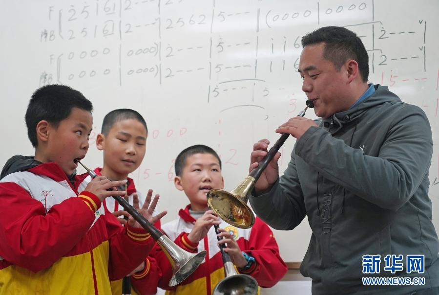 唢呐老师(右一)在教孩子们吹奏技巧(3月4日摄)。