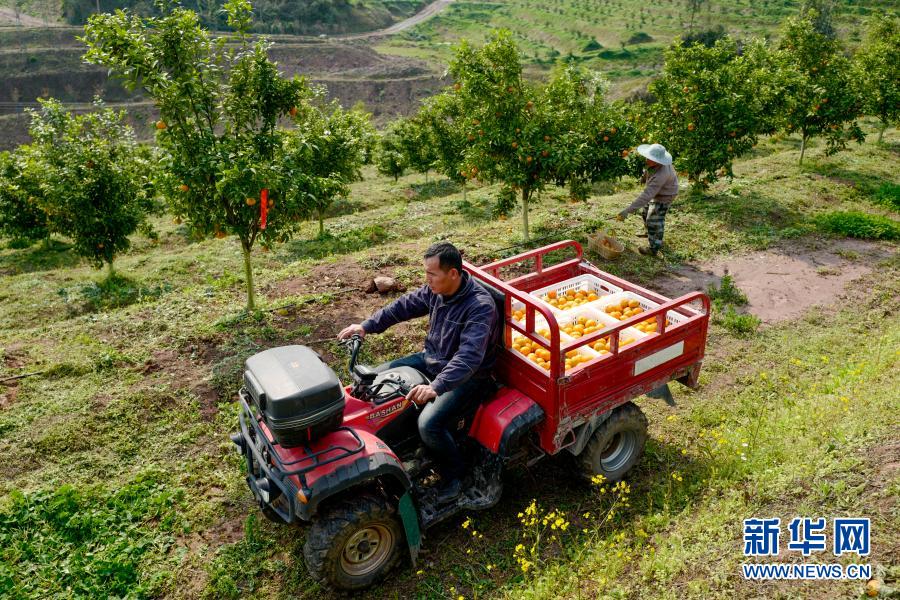 3月4日,在渝北区大盛镇青龙村的现代化果园内,村民驾驶小型农机运送采摘的鲜果。