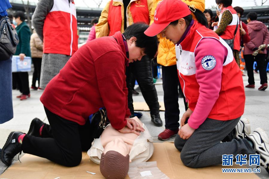 3月5日,参加小草志愿服务广场活动的志愿者(右)为市民介绍心肺复苏急救方法。