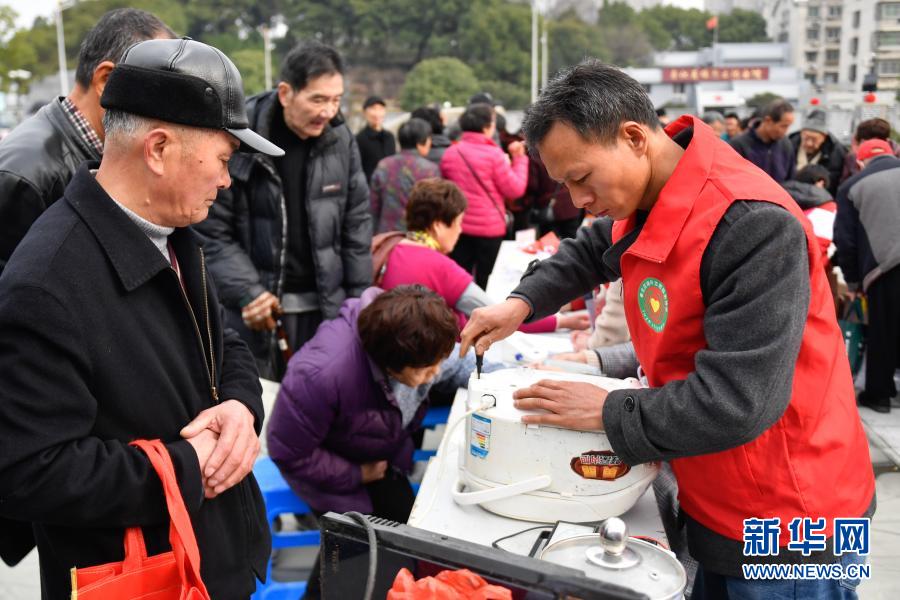 3月5日,参加小草志愿服务广场活动的志愿者(右)为市民免费修理家用电器。