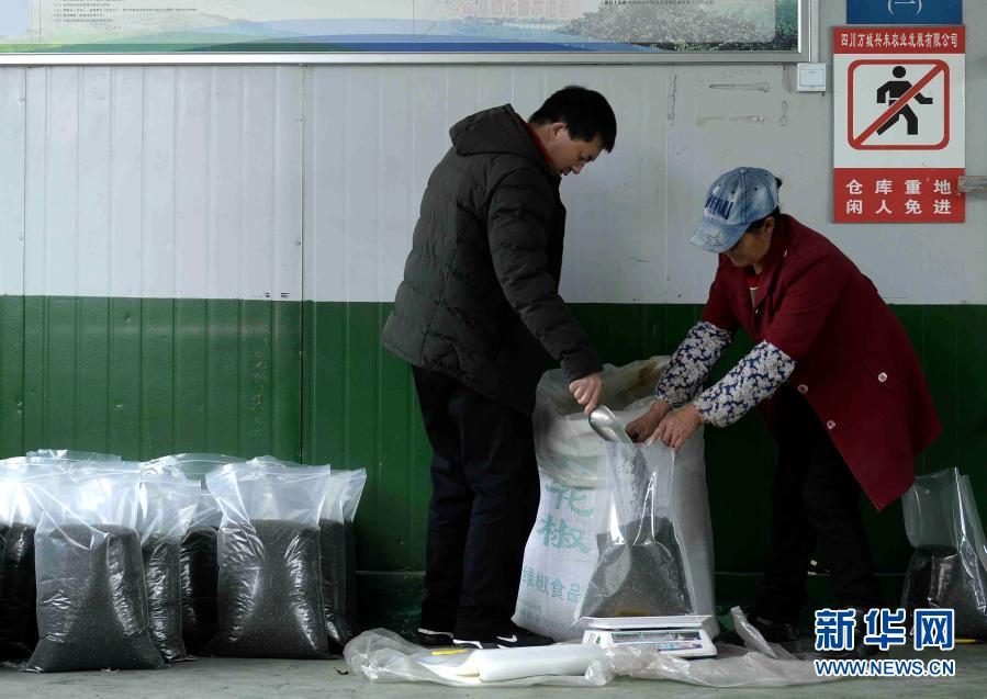 3月3日,客商(左)在四川省巴中市平昌县土兴镇一青花椒加工厂采购青花椒。