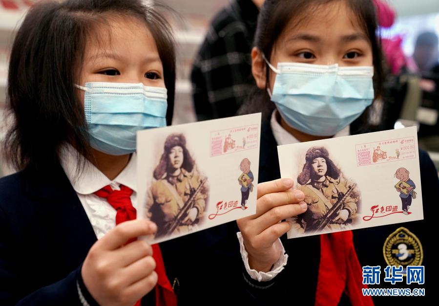 3月5日,小学生在上海红色少年主题邮局展示雷锋主题明信片和当日的纪念邮戳。