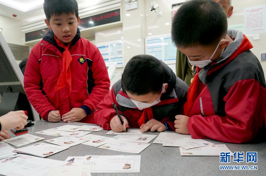 3月5日,在上海红色少年主题邮局,小学生在雷锋主题明信片上书写。