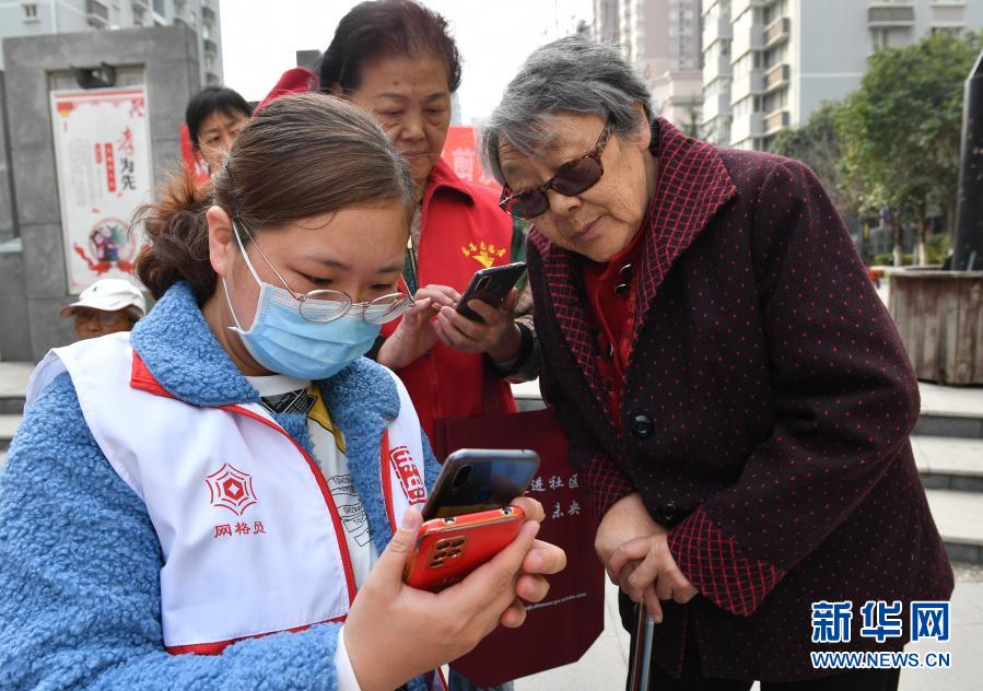 3月5日,在西安市未央区明园社区,志愿者为社区老年人进行智能手机使用辅导。