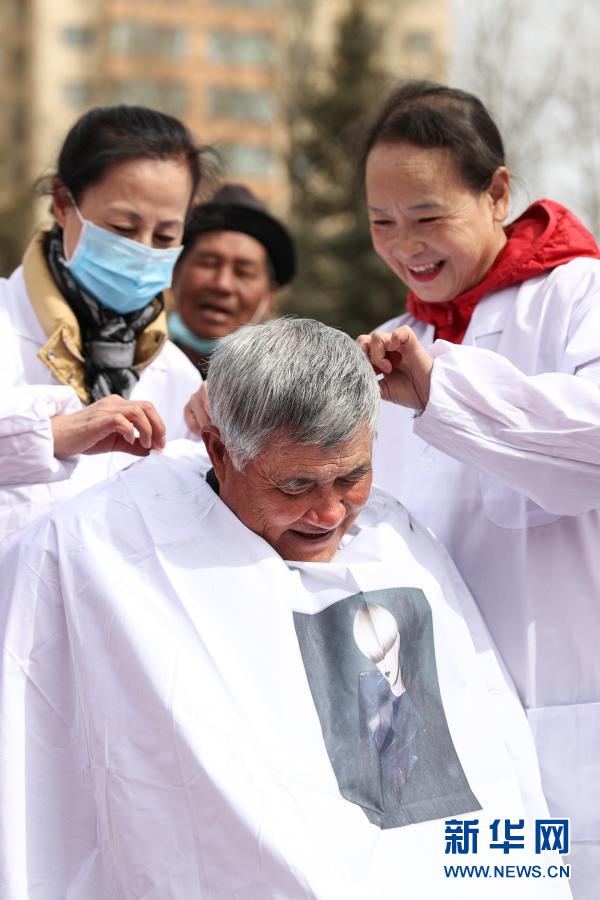 3月5日,在西宁市城中区人民广场,志愿者为老人理发。