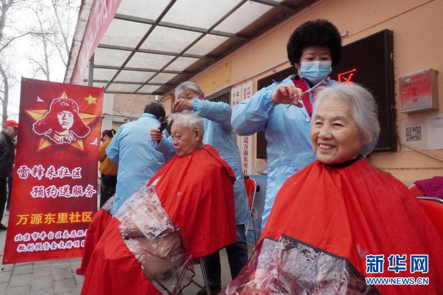 3月5日,北京市丰台区东高地街道的志愿者为社区内的老人理发。