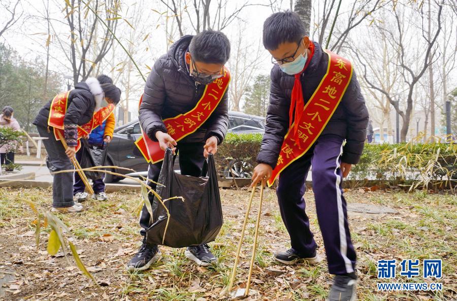 3月5日,北京市丰台区东高地街道的学生志愿者在美化社区环境。
