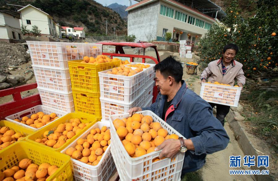3月5日,在石棉县美罗镇坪阳村,果农将采摘的黄果柑搬运到车上。