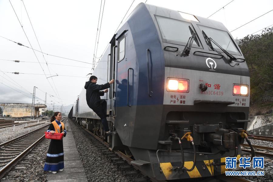 在百色车务段八渡站,厨房工作人员在给火车司机送餐(3月4日摄)。