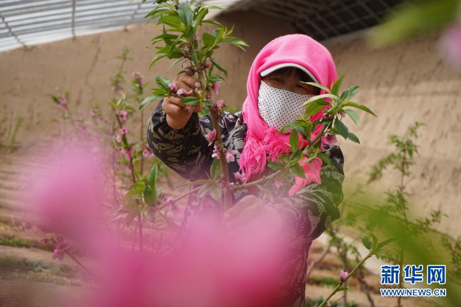 3月5日,民勤县重兴镇红旗村村民李会兰在日光温室大棚为蟠桃树疏果。