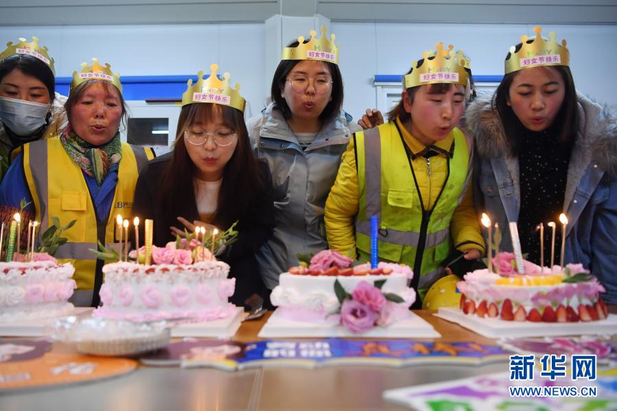 杜萱(左四)和女工友给自己制作的蛋糕吹蜡烛庆祝“三八”妇女节(3月4日摄)。