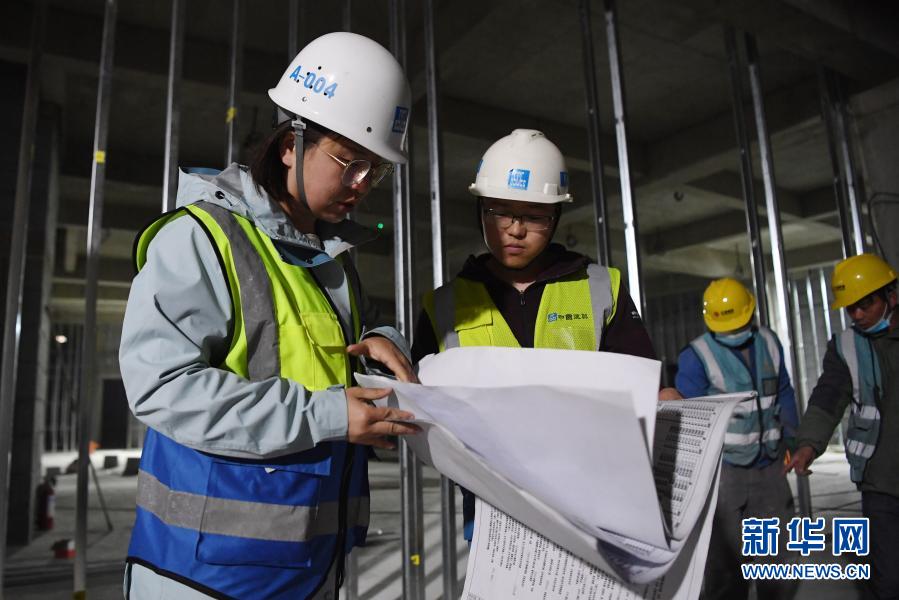 杜萱(左一)在甘肃省妇女儿童医疗综合体项目三标段工地上查看技术图纸(3月4日摄)。