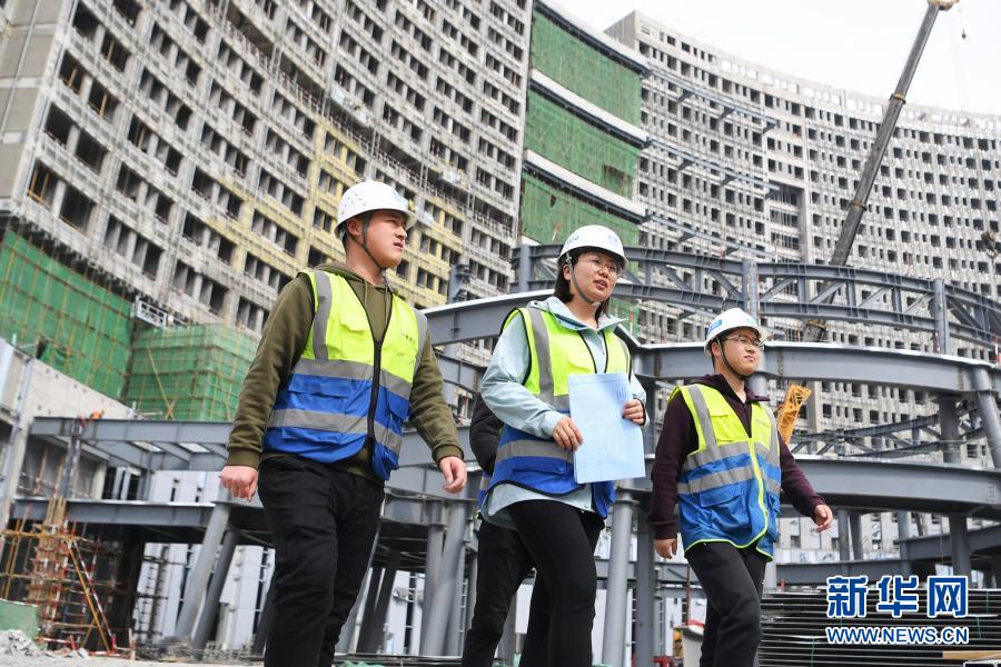 杜萱(中)带领技术人员从甘肃省妇女儿童医疗综合体项目三标段工地上走过(3月4日摄)。