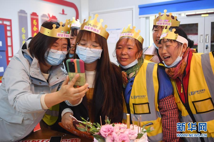 杜萱(左一)和女工友一起庆祝“三八”妇女节(3月4日摄)。