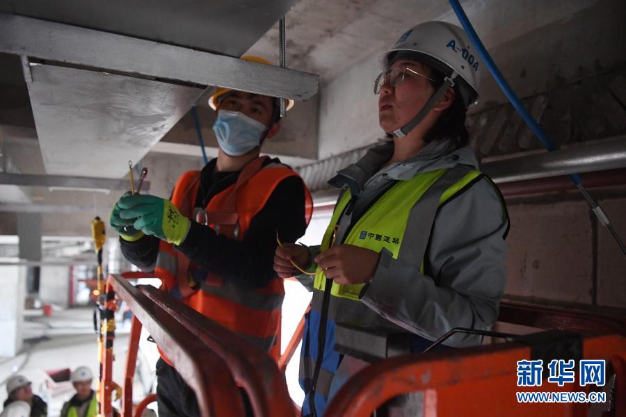 杜萱(右)在甘肃省妇女儿童医疗综合体项目三标段工地上检查指导工人作业(3月4日摄)。