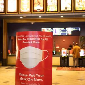 3月5日,美国纽约一家重开的电影院内摆放着佩戴口罩的提示。