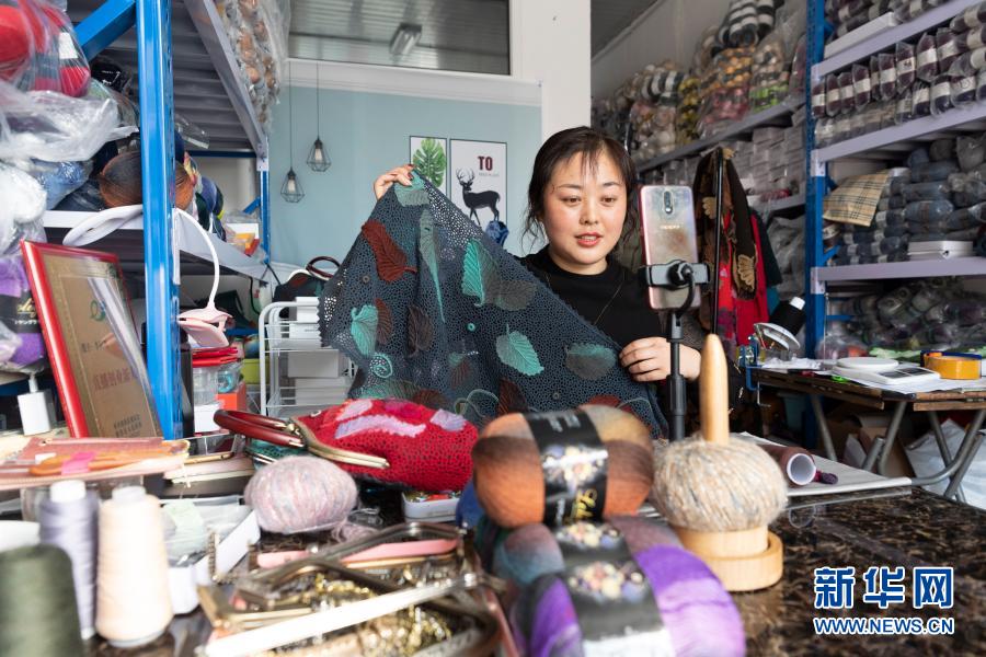 3月5日,在黑龙江省绥滨县的工作室内,李明鸽通过直播展示自己用钩针编织的披肩。