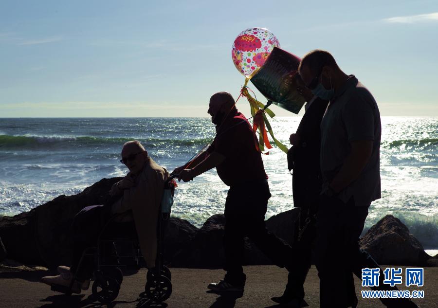 3月5日,亲朋在美国加利福尼亚州半月湾市为一名90岁老人庆生。