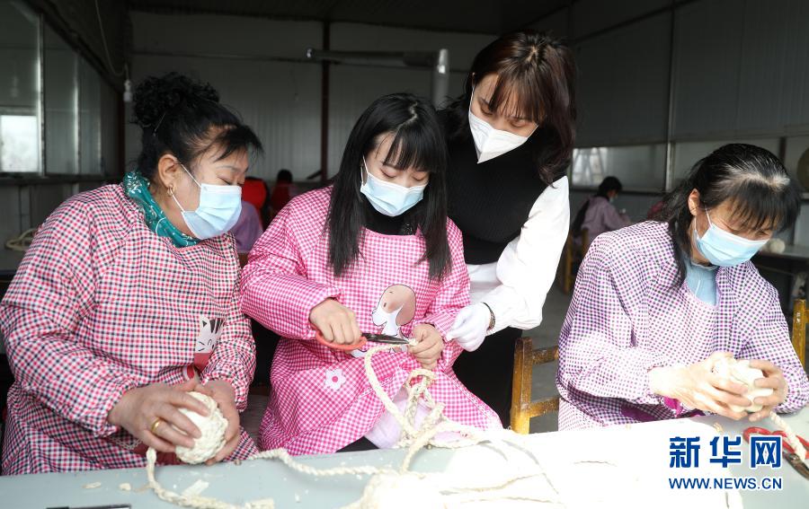3月4日,闫佳欣(右二)在车间内指导妇女们制作手工艺品。新华社记者 蔡湘鑫 摄