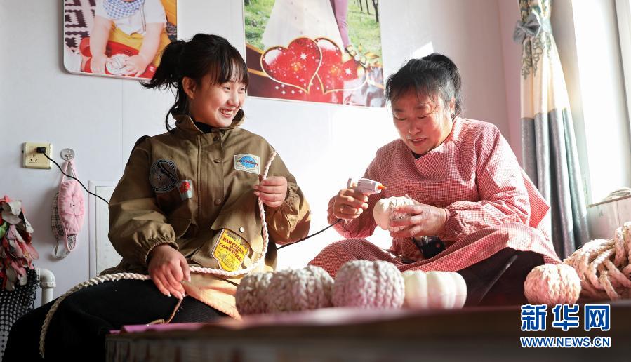 3月4日,闫佳欣(左)在农户家里指导帮助女性村民制作手工艺品。新华社记者 姚剑锋 摄
