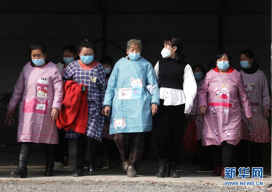3月4日,午休时间到了,闫佳欣(前右二)和村里的妇女走出工厂车间大门。新华社记者 姚剑锋 摄