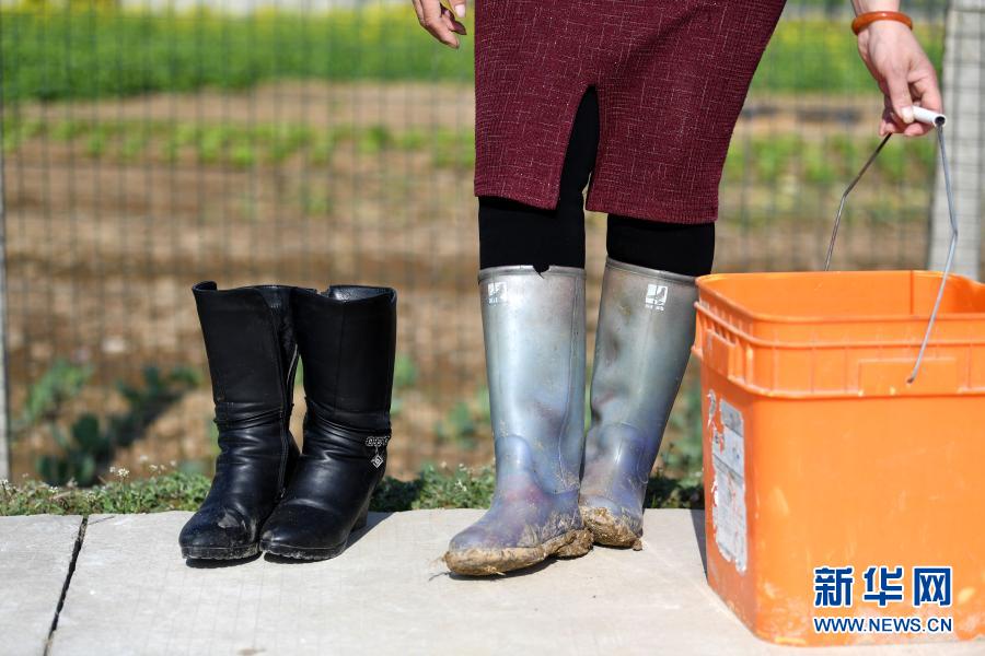 3月4日,在舒城县南港镇公义村钱元玲家庭农场,钱元玲在摘完菜后准备换下雨靴。新华社记者 刘军喜 摄