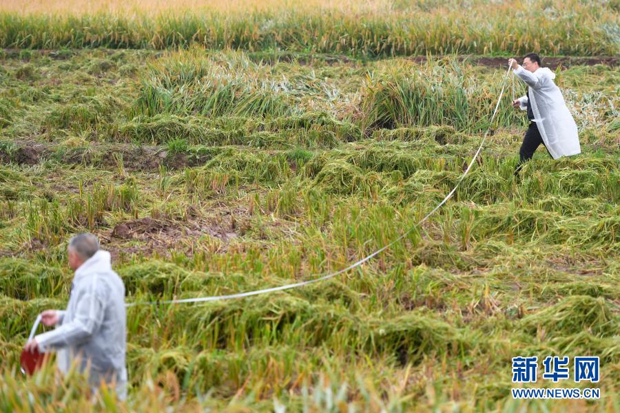2020年11月2日,在湖南省衡阳市衡南县清竹村第三代杂交水稻“叁优一号”衡南试验示范基地,工作人员在测量示范田面积。经测产专家组评定,由“杂交水稻之父”袁隆平团队研发的杂交水稻双季亩产突破1500公斤大关,其中晚稻品种为第三代杂交水稻。新华社记者 陈泽国 摄