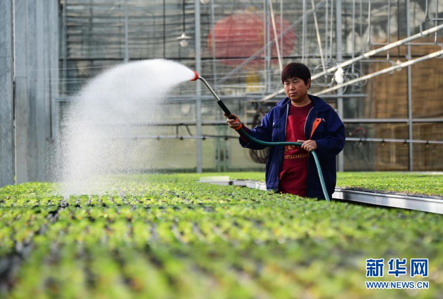 3月6日,河北省邯郸市曲周县育苗产业园工人为蔬菜秧苗浇水。新华社记者 朱旭东 摄