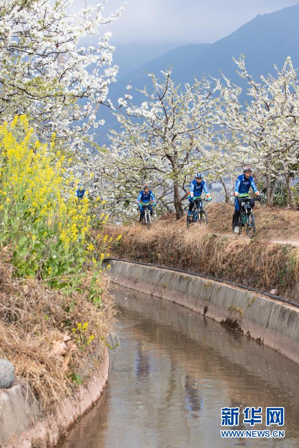 3月5日,在汉源县九襄镇大田村,当地骑行爱好者沿着东大堰在花丛中骑行。新华社记者 江宏景 摄