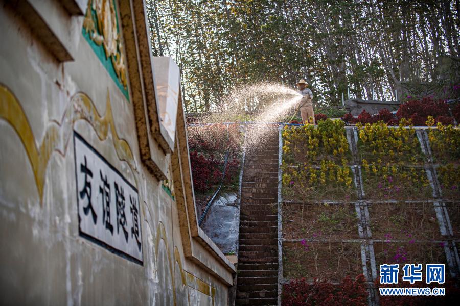 工人在友谊隧道为绿化带浇水(3月5日摄)。新华社记者 江文耀 摄