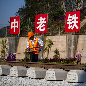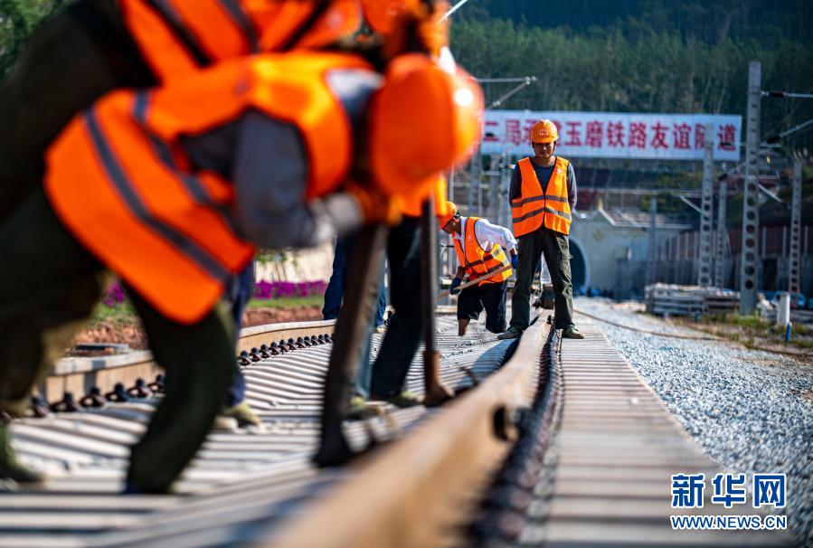 工人在友谊隧道附近进行铺轨作业(3月5日摄)。新华社记者 江文耀 摄