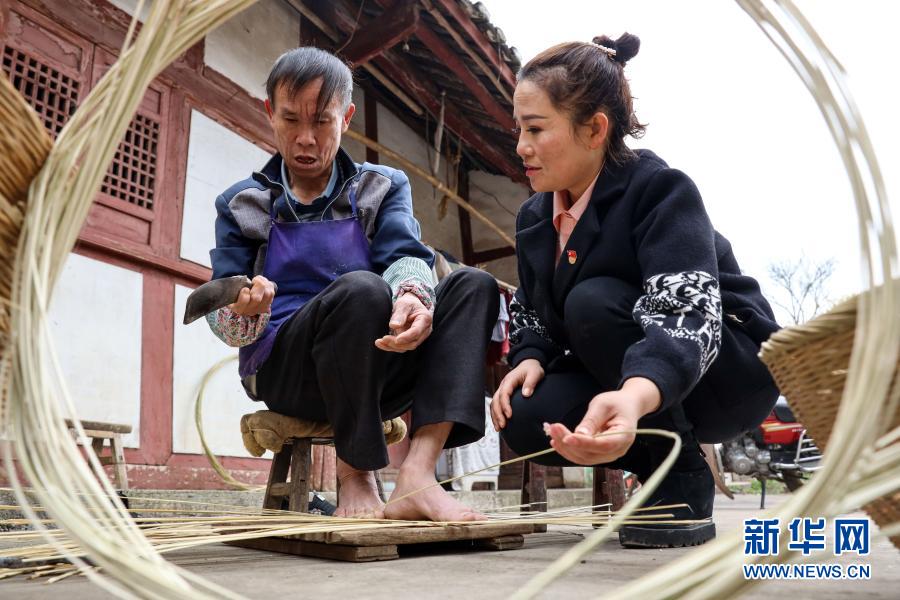 3月6日,坪子社区第一书记吴穷(右)在询问社区村民胡勇通过竹编致富的情况。新华社记者 欧东衢 摄