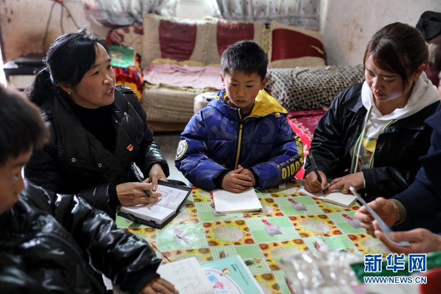 3月6日,坪子社区支部副书记孙美(左二)、社区干部何可花(右一)在村民胡永葵家内家访。新华社记者 欧东衢 摄