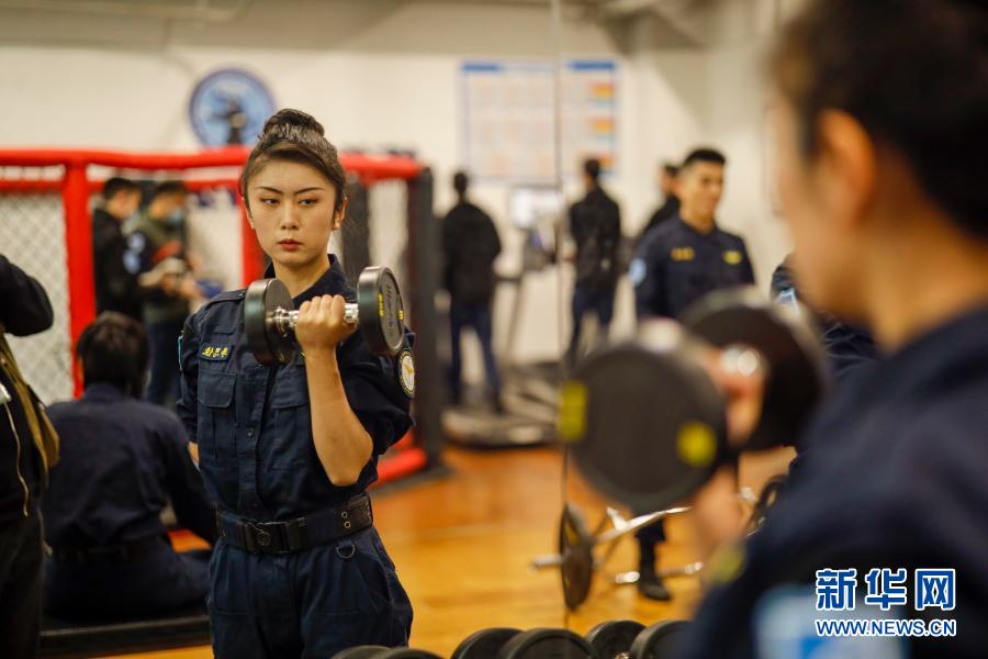 3月5日,华夏航空的女子航空安全员李思佳在训练室内进行力量练习。