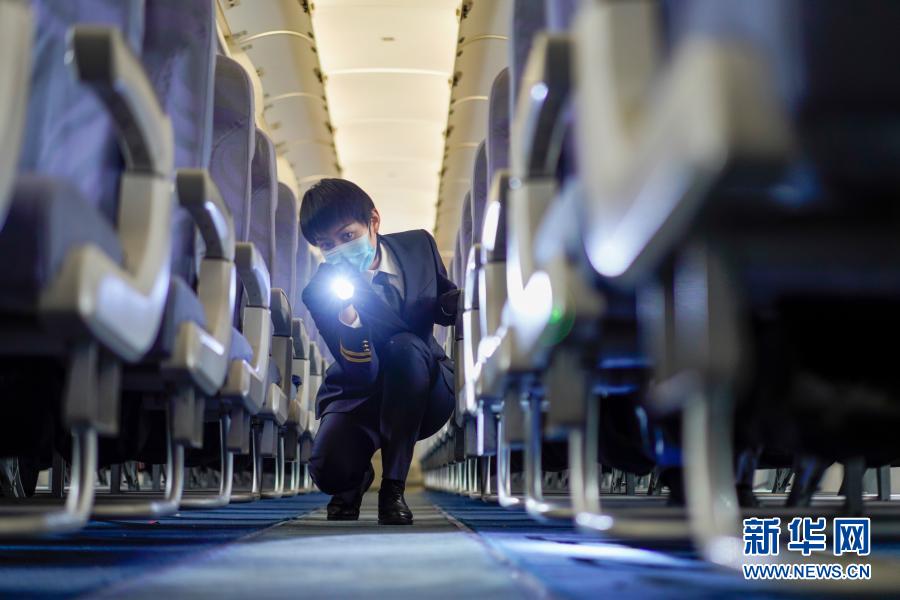 2月25日,华夏航空的女子航空安全员刘瑶在客机机舱内进行安全检查。