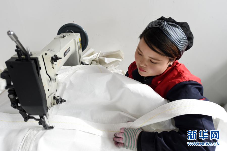 在东乡族自治县大树乡南阳洼村扶贫车间,马林红生产集装袋(3月4日摄)。新华社记者 范培珅 摄
