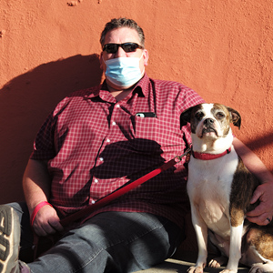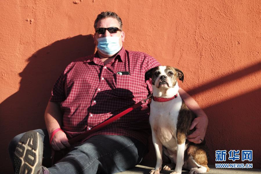 3月6日,一名男子在美国加利福尼亚州米尔布雷带着狗在街头晒太阳。