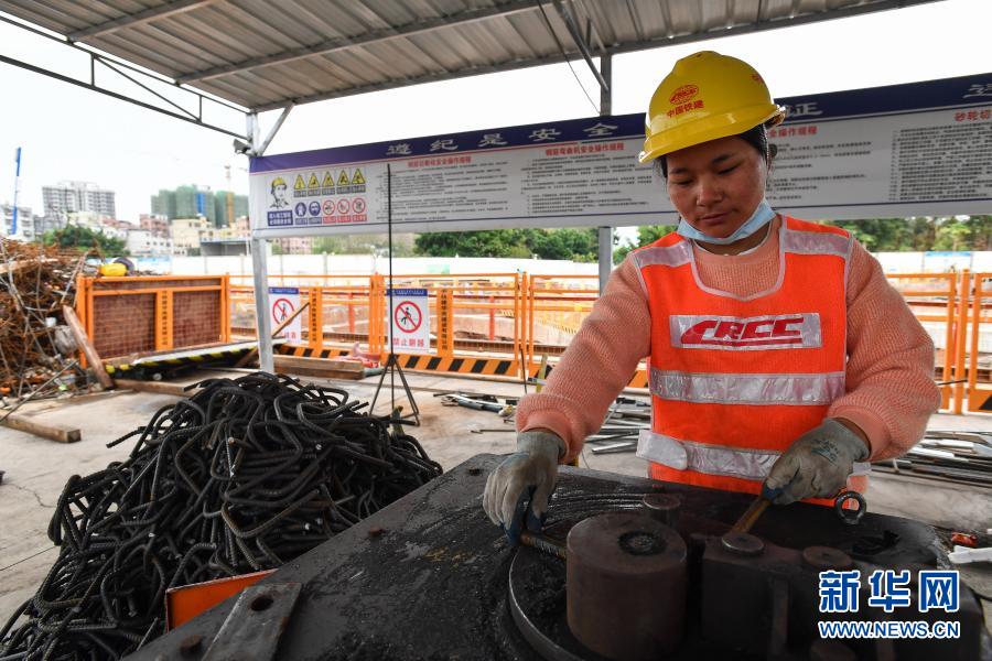 3月7日,彝族劳务工阿来伍各在广州地铁18号线石榴岗基地加工钢筋。阿来伍各来自四川大凉山喜德县。