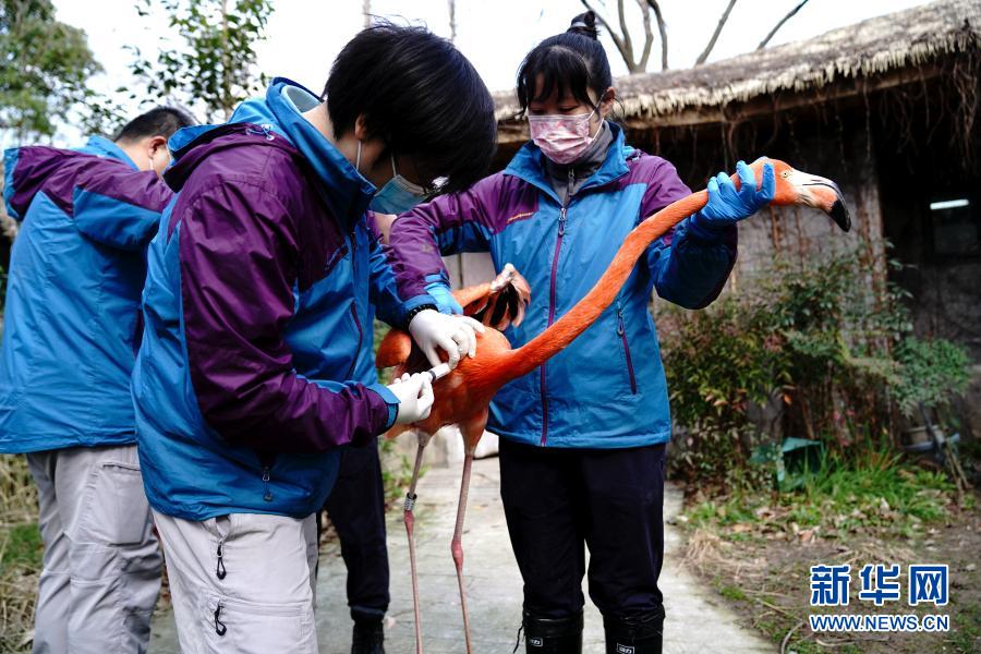 3月3日,上海动物园的兽医给火烈鸟接种疫苗。