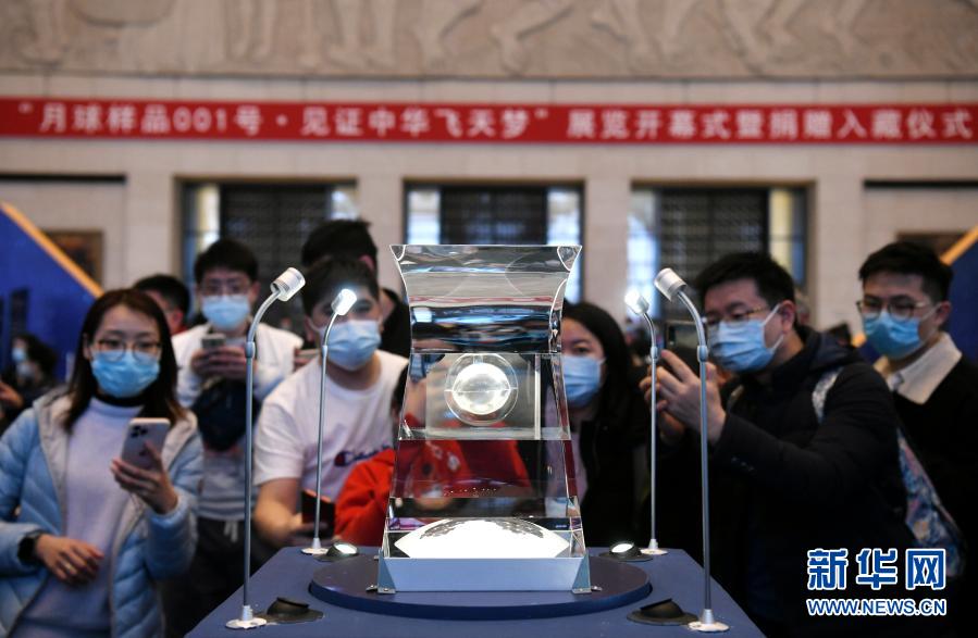 2月27日,“月球样品001号·见证中华飞天梦” 展览开幕式暨捐赠入藏仪式在北京中国国家博物馆举行。这是人们参观拍摄月球样品001号。