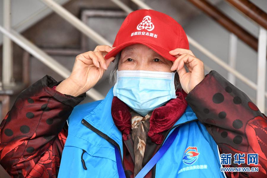 在北京市海淀区北太平庄街道金晖远洋社区服务站,邰玉珍整理衣帽准备进行社区巡逻(3月5日摄)。