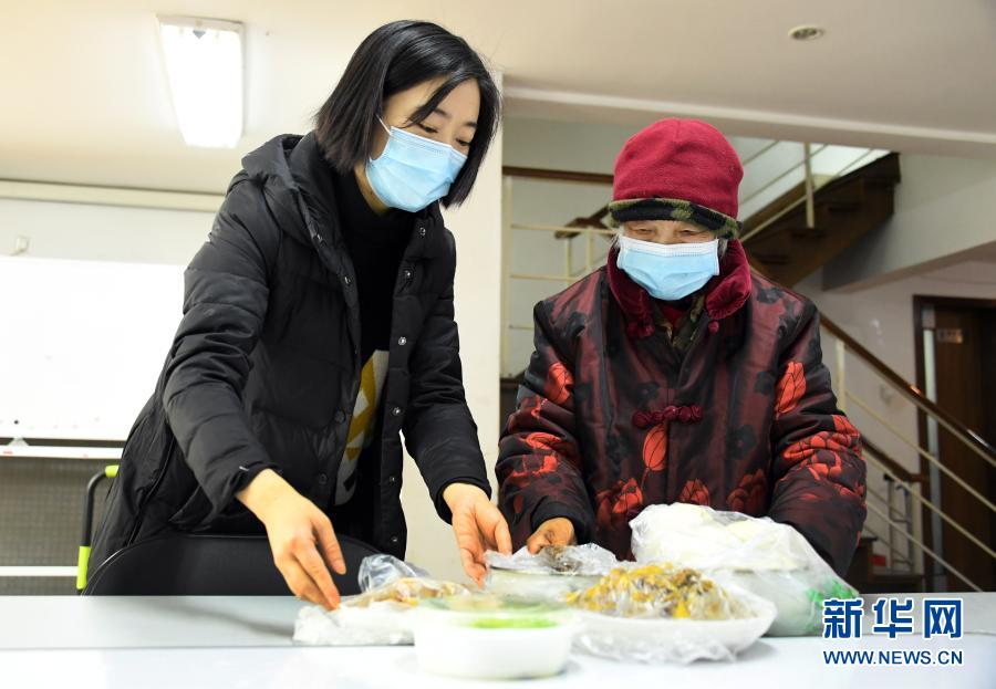 3月7日,在北京市海淀区北太平庄街道金晖远洋社区服务站,邰玉珍(右)与社区工作人员刘芬准备爱心午餐。新华社记者 任超 摄