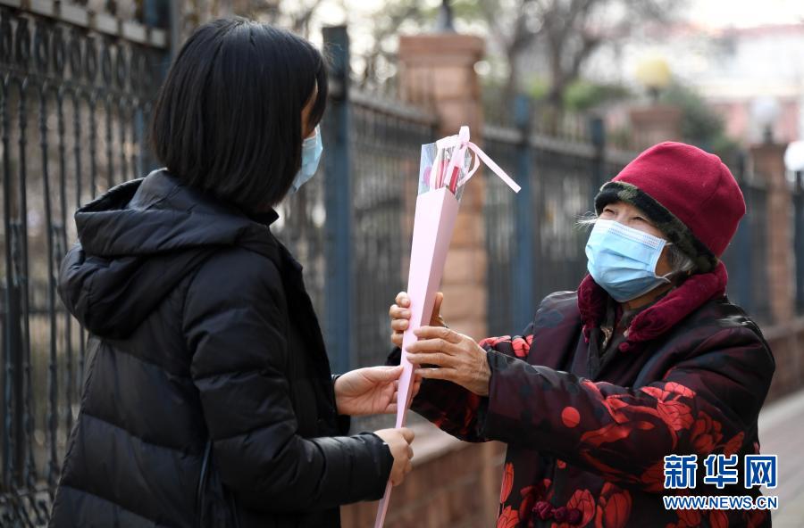 三八妇女节前夕,北京市海淀区北太平庄街道金晖远洋社区工作人员刘芬(左)代表社区为邰玉珍送上鲜花(3月7日摄)。新华社记者 任超 摄
