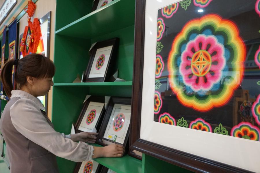 青海省海东市互助土族自治县的土族盘绣园内摆放的“太阳花”装饰画(3月5日摄)。新华社记者 央秀达珍 摄